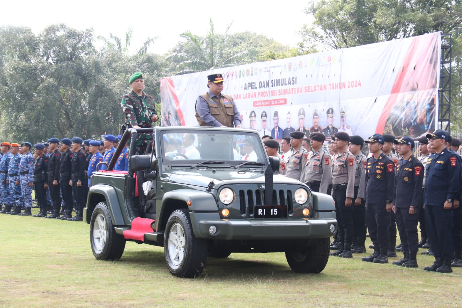 Kapolda Sumsel Irjen Pol A. Rachmad Wibowo,SIK bersama Kasatwil jajaran dan Forkompimda Provinsi Sumsel serta instansi Terkait lainnya melaksanakan Apel Siaga dan Simulasi Penanggulangan Kebakaran Hutan dan Lahan (Karhutla) Provinsi Sumatera Selatan (Sumsel) Tahun 2024 digelar di halaman Griya Agung, Palembang, hari ini. Acara ini dipimpin langsung oleh Menteri Koordinator Bidang Perekonomian, Airlangga Hartarto, selaku inspektur upacara, Sabtu (20/07/24).